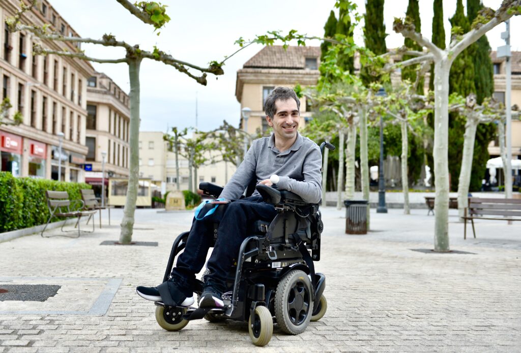Javi va en silla de ruedas eléctrica. La mueve con su mano izquierda gracias a un mando que es una pelota de golf. El factor sorpresa de la espasticidad hace que no siempre atine a coger la pelotita a la primera, pero es totalmente autónomo con la silla.