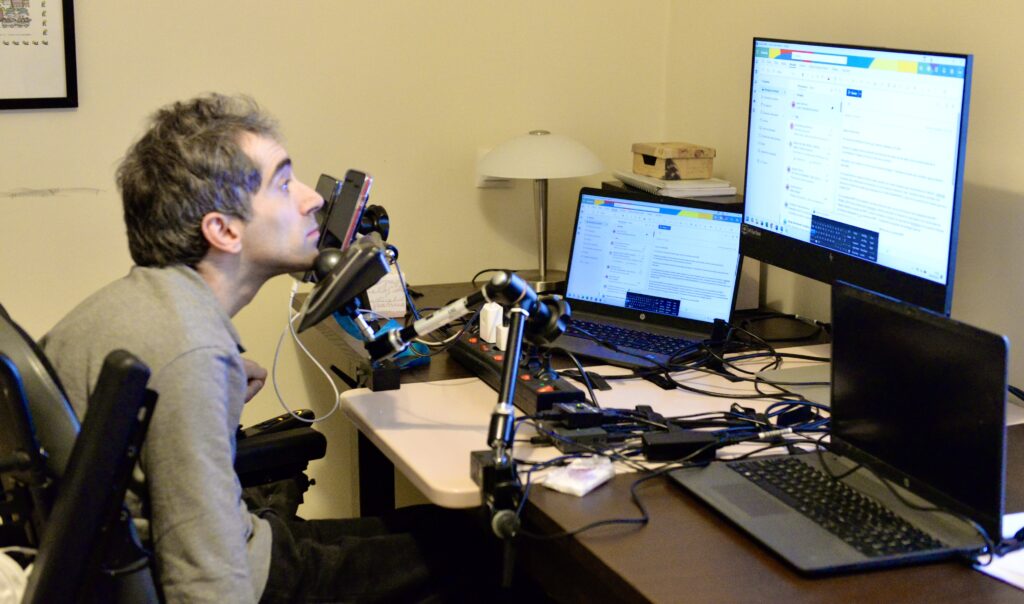 Llego a su casa unos minutos antes de lo acordado y lo pillo trabajando. Con la barbilla y la boca mueve una esfera que le permite usar el ordenador. Tiene un ordenador portátil conectado a una pantalla. Mientras termina de trabajar lo miro y saco alguna foto. Casualmente suena el móvil. Cuando está trabajando lo tiene colocado en un soporte similar al que tiene la esfera. Es su madre. La llamada coincide con un espasmo de Javi, que da un grito y mueve el cuerpo y los brazos. En cuanto termina su cita con la espasticidad desliza la nariz por la pantalla del móvil y descuelga la llamada. Cuando no está en el ordenador lleva el móvil sobre un taco que tiene entre las piernas para mantener la postura.